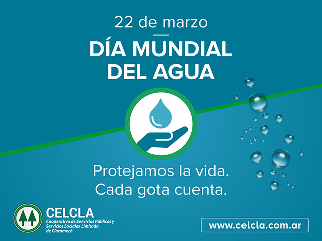 La Cooperativa de Servicios Públicos y Servicios Sociales Limitada de Claromecó adhiere a la celebración del 22 de marzo como Día Mundial del Agua, instituida desde 1993 por Naciones Unidas con el objetivo de concientizar sobre la importancia del agua potable y la defensa de la gestión sostenible de los recursos hídricos. En este sentido, la CELCLA sostiene una política de cuidado y preservación de este esencial recurso acercando diversos consejos a la comunidad a través de los medios de comunicación.