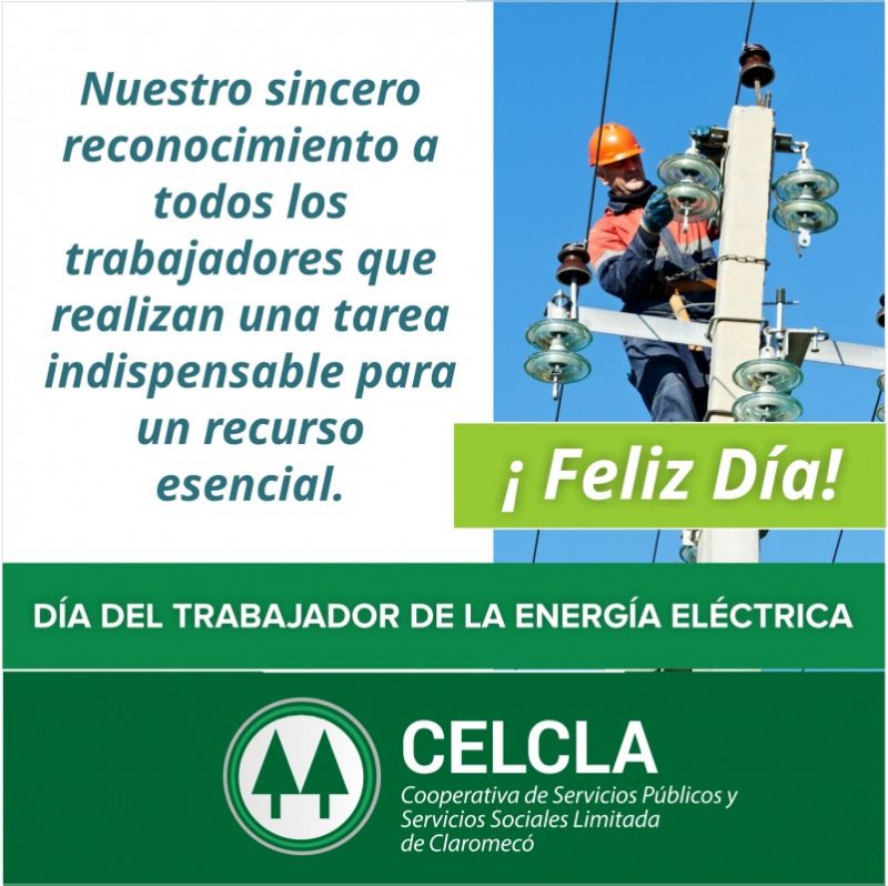 El Consejo de Administración de la Cooperativa Eléctrica Limitada de Claromecó envía un cordial y afectuoso saludo a todos los trabajadores de la electricidad en su día.
