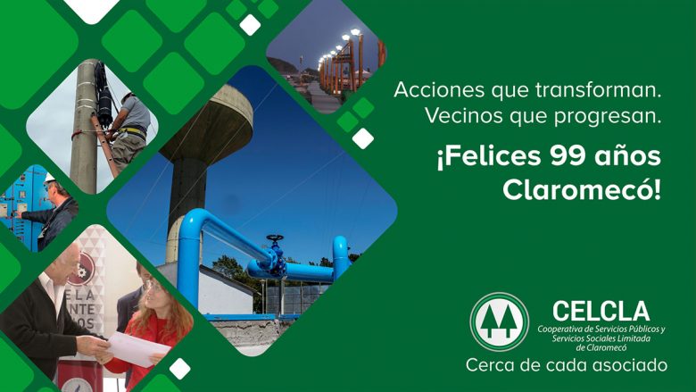 El Consejo de Administración de la Cooperativa de Servicios Públicos y Servicios Sociales Limitada de Claromecó hace llegar un cordial y afectuoso saludo a todos los vecinos de la localidad con motivo de celebrarse el 99º Aniversario de su fundación.